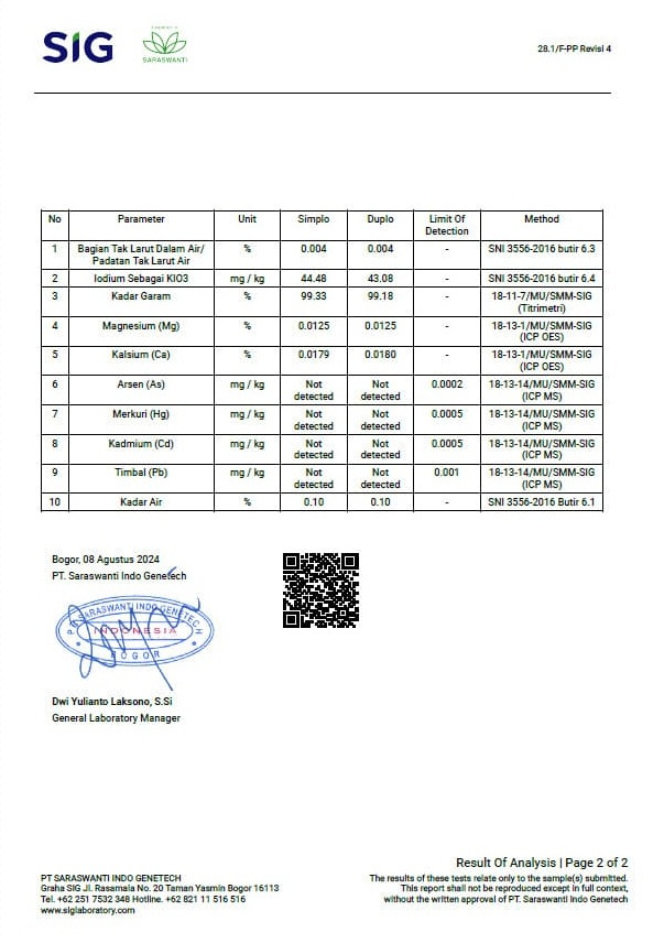 Garam Industri (CoA) Sampel diuji untuk berbagai parameter kualitas, meliputi kadar air, kandungan natrium klorida (NaCl), bagian yang tidak larut dalam air, kadar iodium (KI₀₂), serta logam berat seperti kadmium (Cd), timbal (Pb), arsen (As), dan merkuri (Hg). Pengujian ini bertujuan untuk memastikan kesesuaian produk dengan standar mutu dan keamanan yang berlaku.